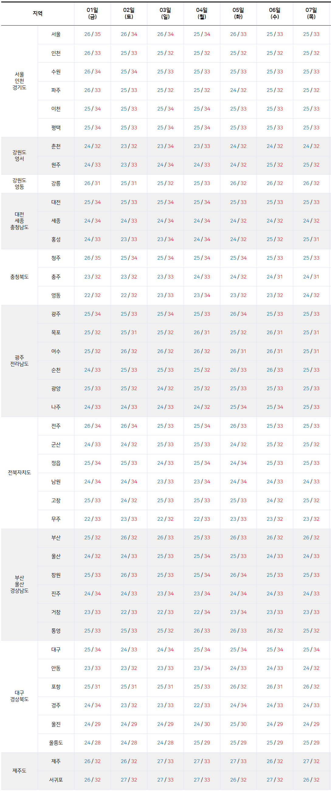 2025년 8월 1일 ~ 8월 7일 전국 기온 예보