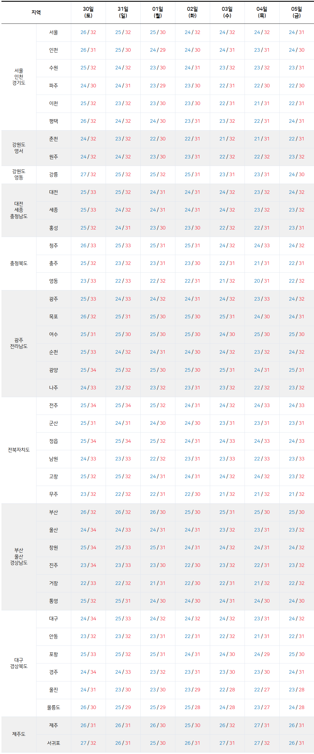 - 2025년 8월 30일 ~ 9월 5일 전국 기온 예보