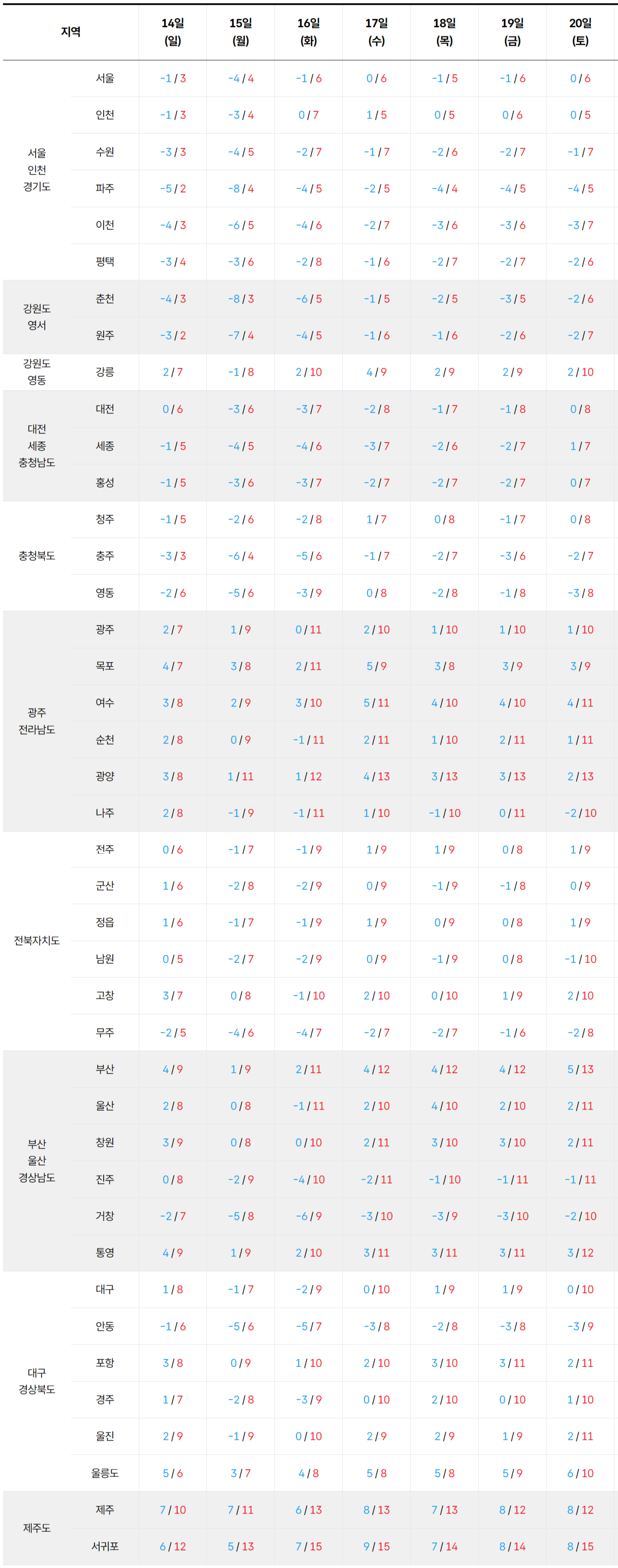 - 2025년 12월 14일 ~ 12월 20일 전국 기온 예보