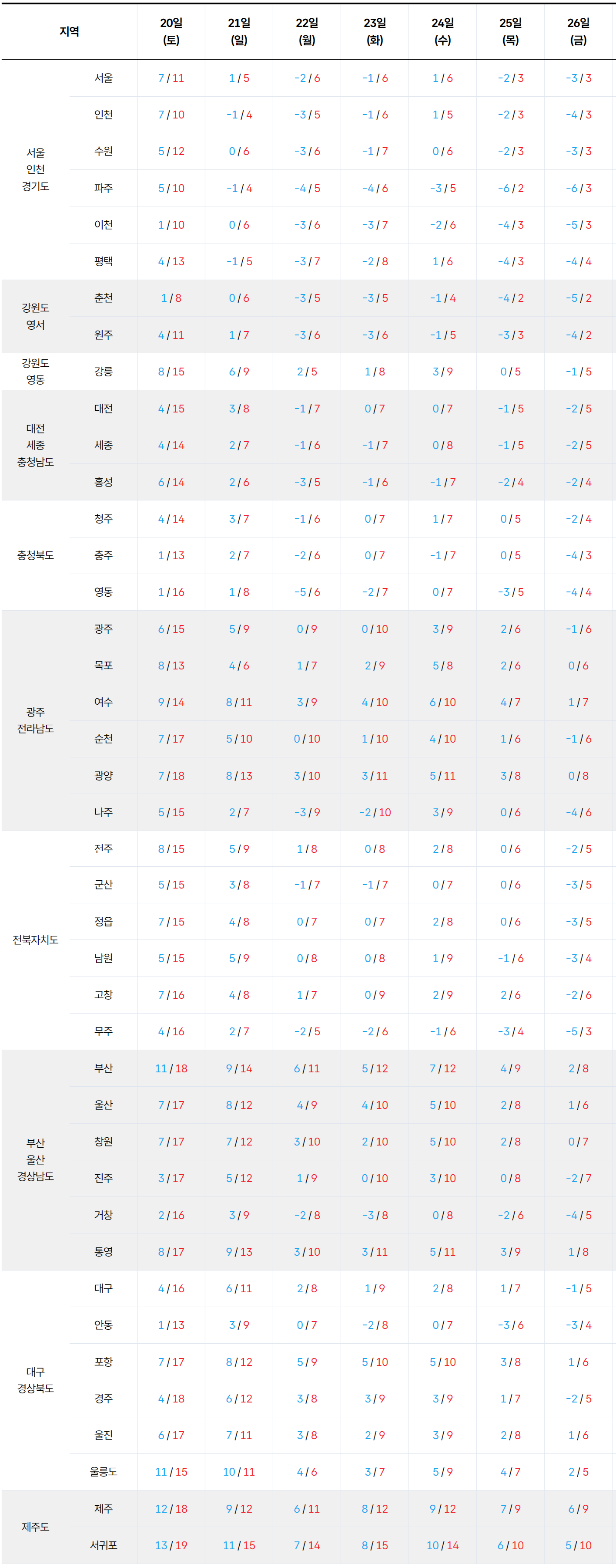 - 2025년 12월 20일 ~ 12월 26일 전국 기온 예보