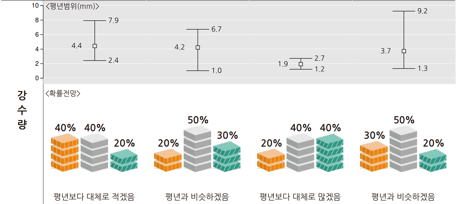 -강수량의 평년 범위 2.4 ~ 7.9㎜보다 적을 확률 40%